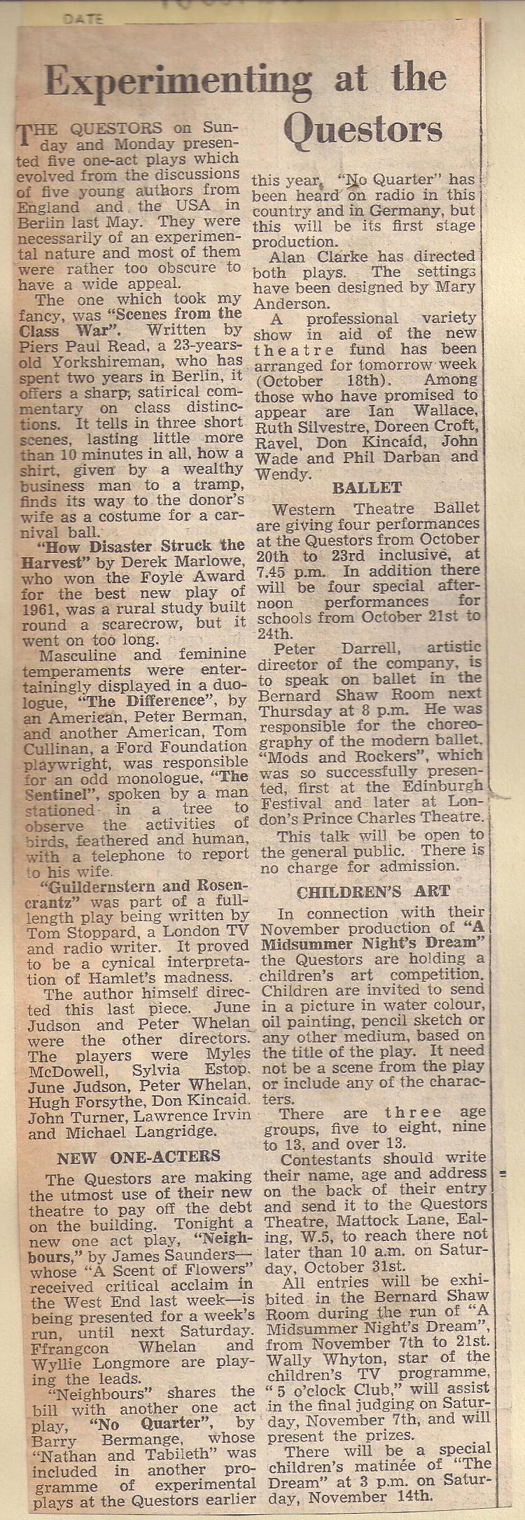 With him was Derek Marlowe, as it happens a former Questors student. Derek went on to write a feature film with Laurence Harvey, adapted from his novel A DANDY IN ASPIC.