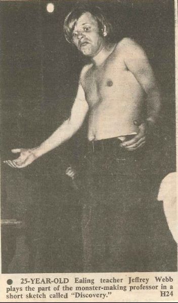 A dramatic photo of Geoff Webb, who had already graced the Questors stage as a sailor in THE FLYING DUTCHMAN before joining the First Year Group, featured in the Hounslow Post's review of the “exciting, stimulating and very entertaining” Students at Work in July 1968 (below).