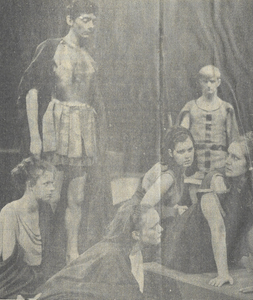 "... some nice playing, and some good moments. Wylie Longmore, arms and fingers bent and outspread, a bounding black eagle, as the witch-boy. Sorceress Estelle Hampton and Cleopatra Wrighton tormenting and enslaving him with a perilously whirling axe, their long hair like golden and ebony seaweed.