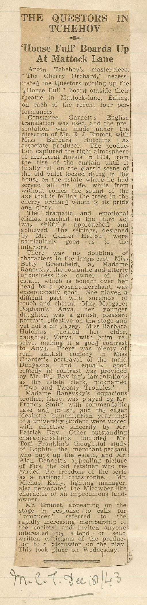 Alfred Emmet, Mary Chanter, Eileen Clarke, George Frost, Gunter Heilbut, Barbara Hutchins, Michael Kelly, Honor O'Nians, Graham Matthew, Fred Robinson