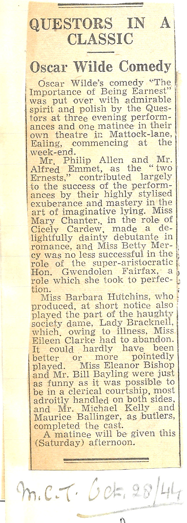 Philip Allen, Maurice Ballinger, Bill Bayling, Eleanor Bishop, Mary Chanter, Eileen Clarke, Alfred Emmet, Barbara Hutchins, Michael Kelly, Betty Mercy