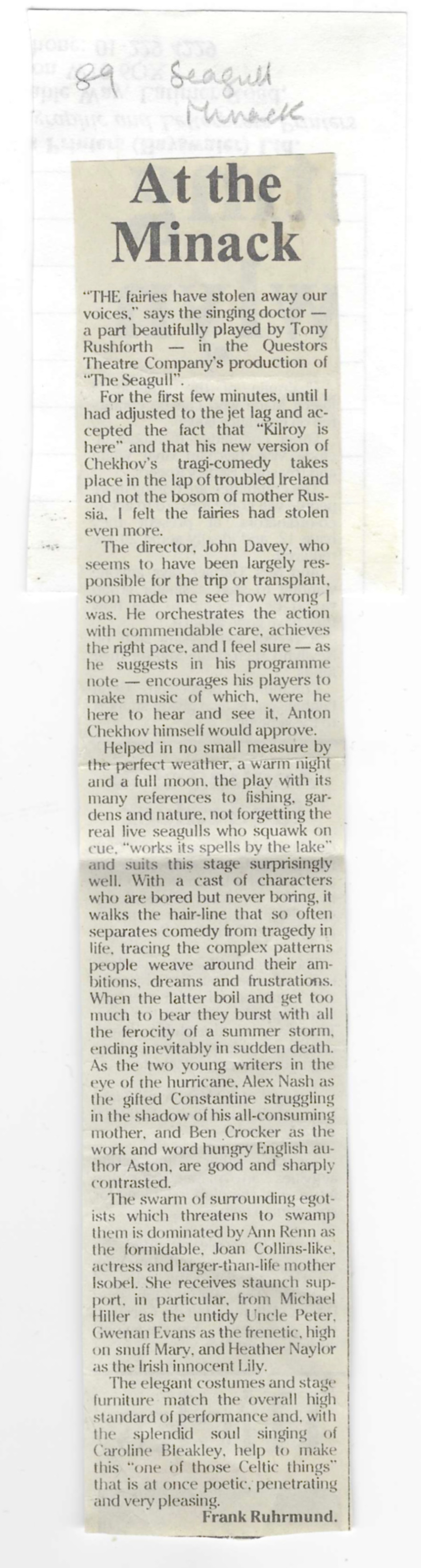 Production Team: [The Questors Playhouse] Mary Anderson, Kate Armstrong, Brad Askew, Glyn Backshall, Catherine Bassett, Anya Beale, Christine Brand, Claire Broughton, Ray Childe, John Davey, Jane Dewey, Ray Dunning, Susanna Fyson, Sally Grace, Ian Gwyn Thomas, Lesley Harris, Tim Haywood, Richard Hetherington, Betty Howard, Vandra Howard, Susan Jagger, Kate Jay, Sylvia Juren, Michael Marsh, Val Moran, Andrew Rungen, Harriet Simon, Lucille Terry, Peter Terry, Martin Udall, Lindsay Udell, Tess Walsh, Debbie Ward, Lyn Williams, Frank Wood, Alessandra Zegna
