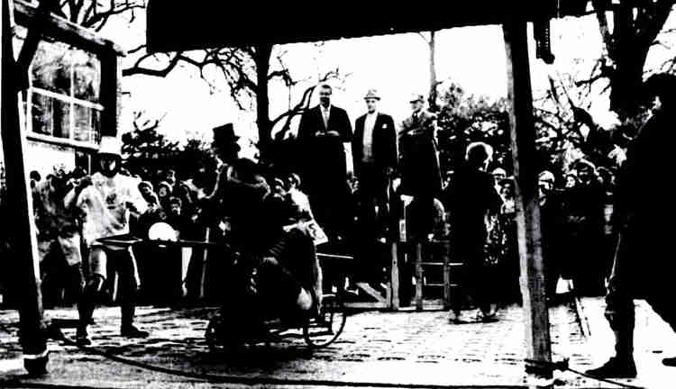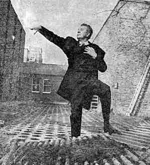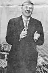 When the smoke cleared. the purple structure lay in pieces on an ground. Sir Michael leapt off the dais, climbed on top of the wreckage and – to the delight of the audience – went through a series of hammed up “conquering hero” poses, mugging furiously for the cameras.