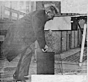 The ceremony began with Sir Michael emerging into the bright. sunlit courtyard to a burst of enthusiastic applause from about 100 people who had gathered around the dais. Sir Michael smiled warmly and waved. A mock team of demolition “experts,” made up of Questors players, attempted to demolish the structure in a variety of unlikely ways — tickling it with feathers, nagging at it, shouting poetry at it — but failing to bring it to collapse.