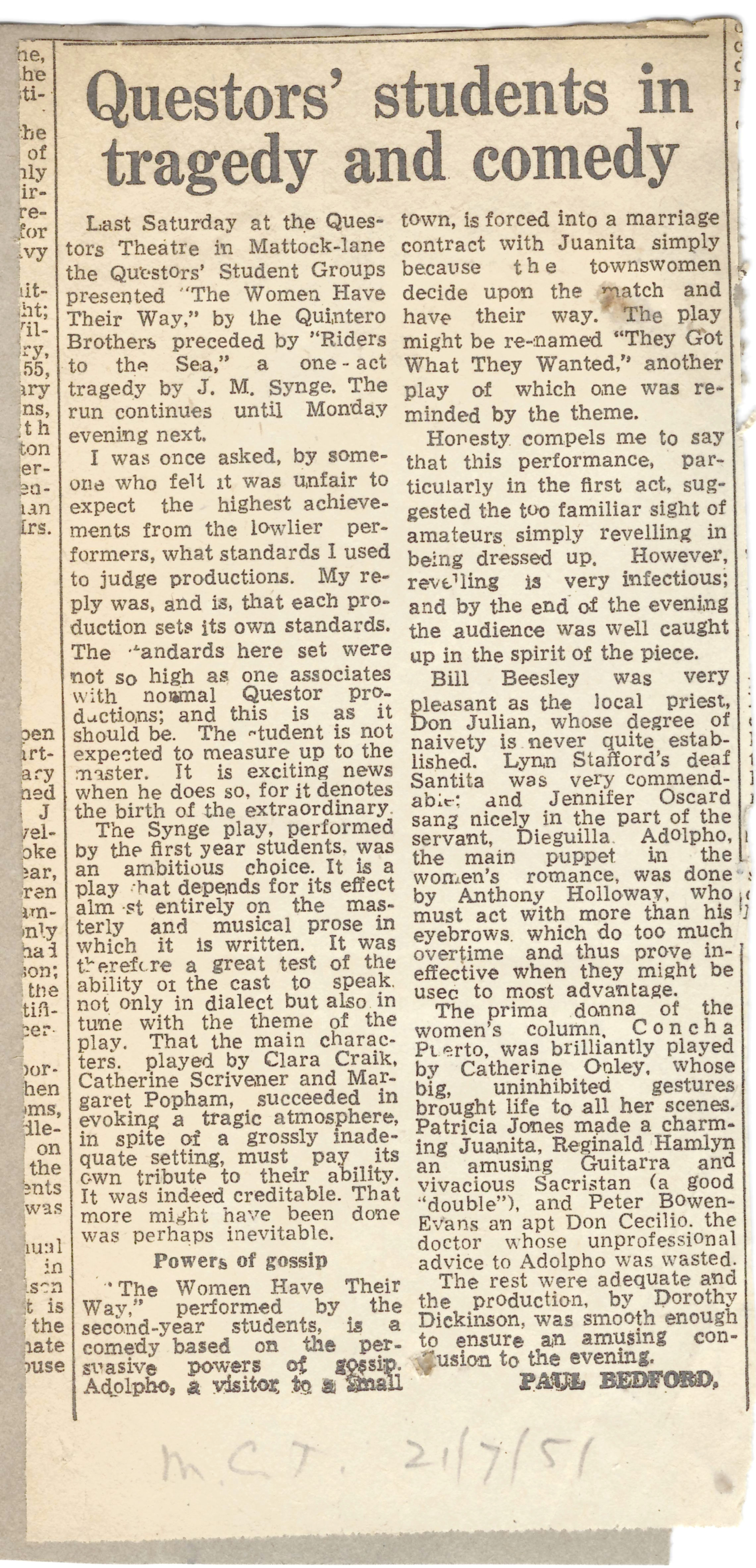 I never auditioned for the main company! I suspect I was too young (17) and soon moved on elsewhere. But for two or three years, as a young male, I was useful in several later Student Group productions.