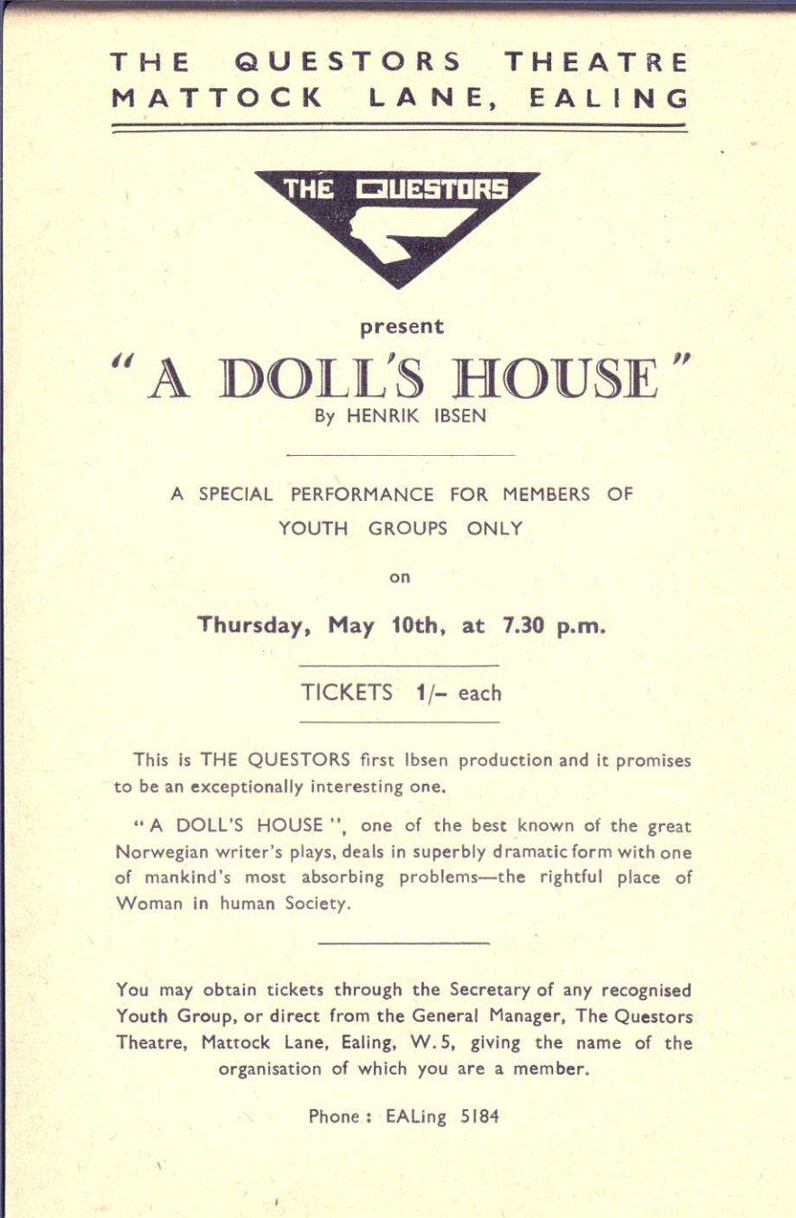"In 1945, another seminal production in terms of development of stage form occurred, when for the first time the action in a naturalistic play was brought out beyond the proscenium arch onto a forestage. The play was Ibsen's A DOLL'S HOUSE, which, incidentally, was actually being performed on VE Day, May 8th.