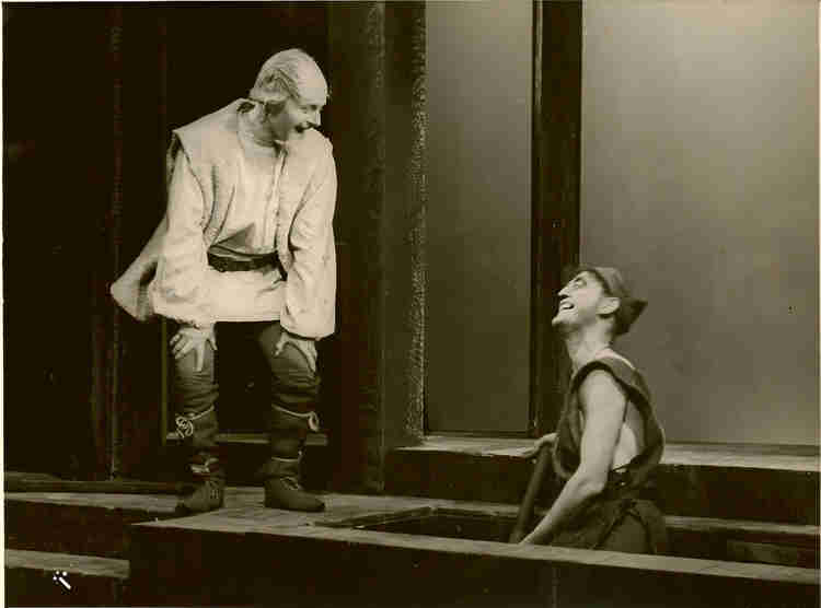 Harry Ives and David Lorraine no doubt stole the show as the grave diggers [right], and other star turns included John Clemow (Mercellus), Vincent McQueen (Horatio), Clifford Webb (Polonius), Frank White (Claudius), Wilf Sharp (First Player), Michael Green (Captain and Osric), Ed Pitt (Young fortinbras) and Cyril Box (who hadn't been around for a few years and for whom this was a final appearance at Questors - all of which seems somehow appropriate that he should play the Ghost of Hamlet's Father!)