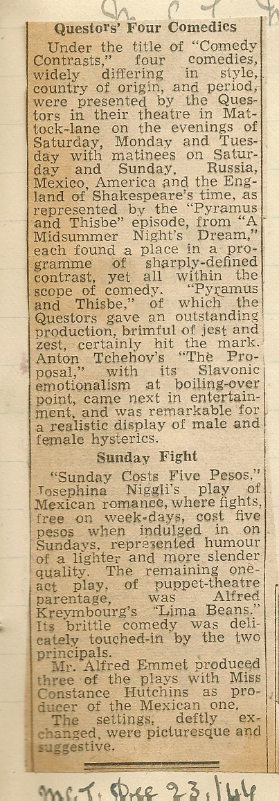 Directed by Alfred Emmet Designed by Honor O'Nians Cast: Bill Bayling, Lempriere Hammons, Jean Sheridan Directed by Barbara Hutchins Designed by Honor O'Nians Cast: Isobel Benns, Gwen Calcutt, Mary Hills, Jean sheridan, Frank White Directed by Alfred Emmet Designed by Honor O'Nians Cast: Philip Allen, Alfred Emmet, Barbara Hutchins PYRAMUS AND THISBE (from A Midsummer night's Dream) by William Shakespeare Directed by Alfred Emmet Designed by Honor O'Nians Cast: Maurice Ballinger, Bill Bayling, Isobel Benns, Gwen Calcutt, Patrick Day, Tom Franklin, Mary Hills, Albert Hooper, Michael Kelly, Eric Voce, Frank White Production Team: E G Cordwell, Alfred Emmet, Barbara Hutchins, Diana Kelly, Herbert R Lucas, Honor O'Nians, Eileen Phillips, Eric Voce The Questors Theatre